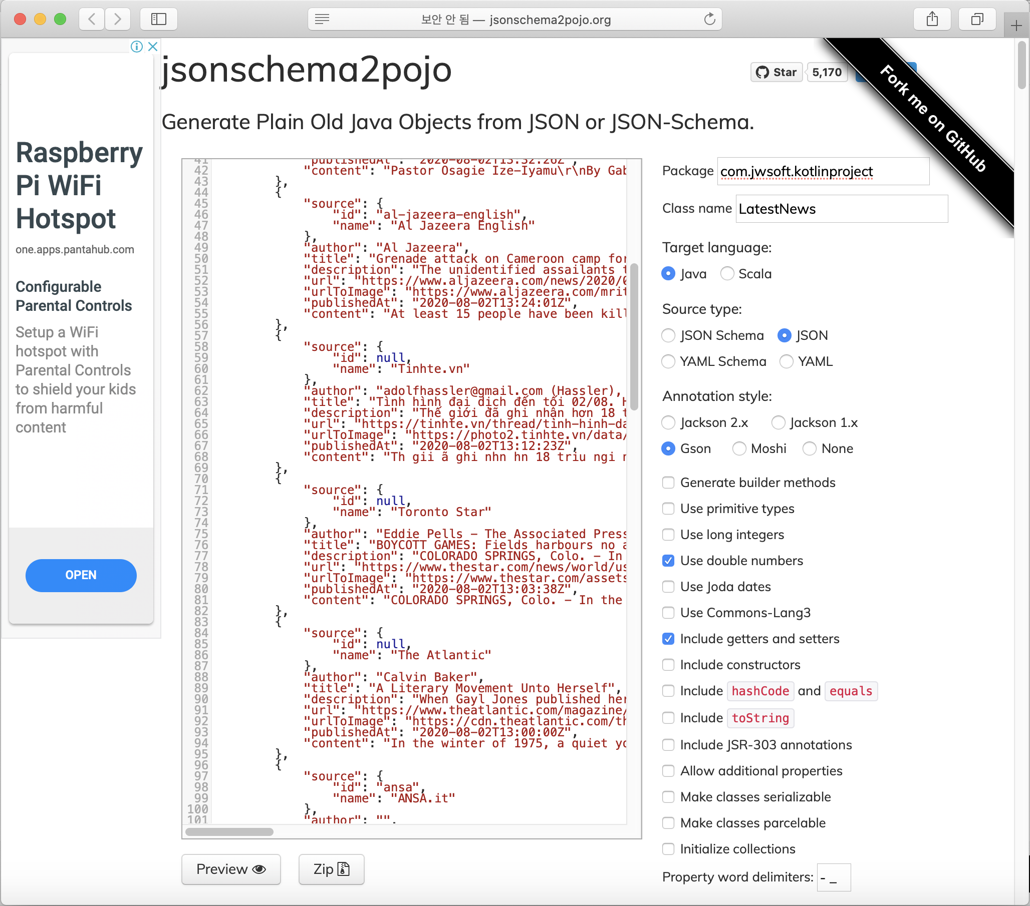 Json 형식으로 된 데이터를 자바 POJO 클래스로 변환 필요