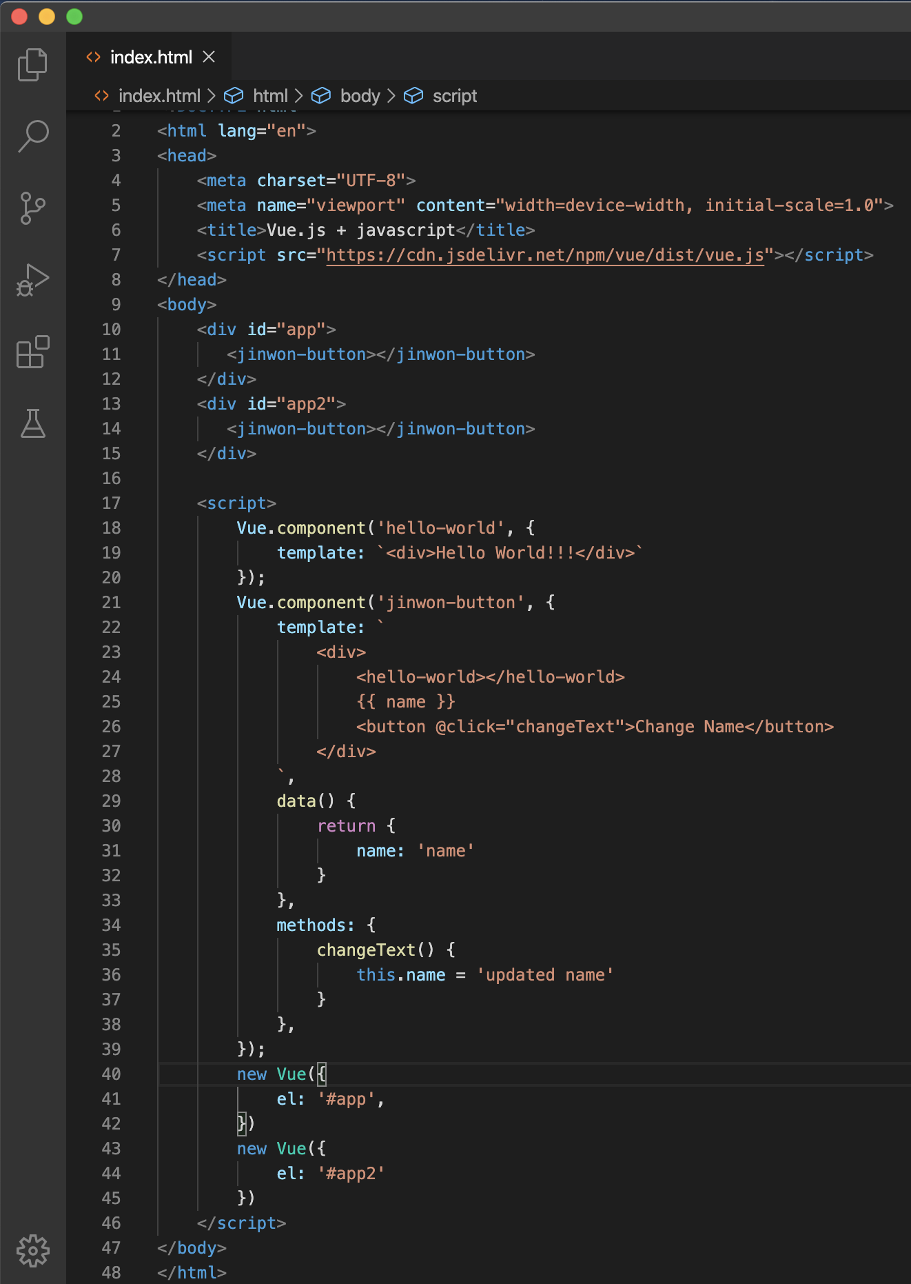즉, Vue 인스턴스 없는 Vue 컴포넌트는 무용지물
