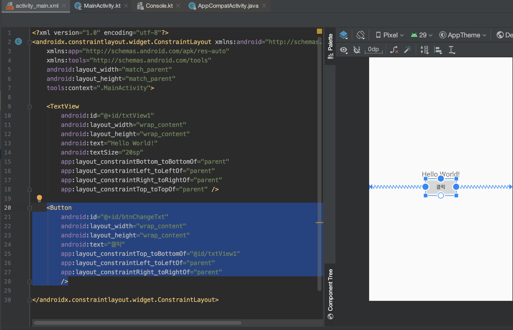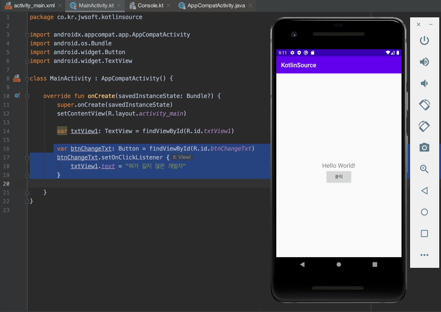 txtView1.text = "혀가 길지 않은 개발자" // 자바에선 이렇게 쓰면 오류 발생 (final 변수로 만들어줘야함)