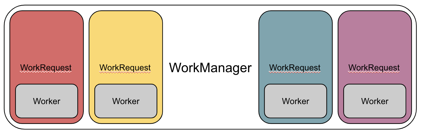 즉, Worker를 WorkRequest에 넣고 WorkRequest를 WorkManager한테 넣어서 관리하도록 한다.