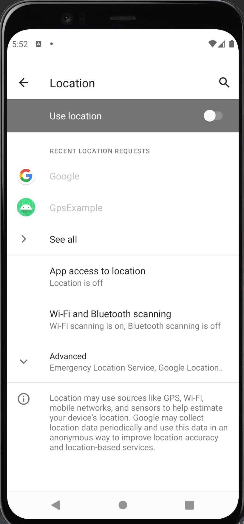 앱에서 위치를 요청하거나 권한 업데이트를 수신해야 한다면 기기는 GPS 또는 Wi-Fi 검색과 같은 적절한 시스템 설정을 사용해야 합니다. 앱은 서비스(예: 기기의 GPS)를 직접 사용 설정하기보다는