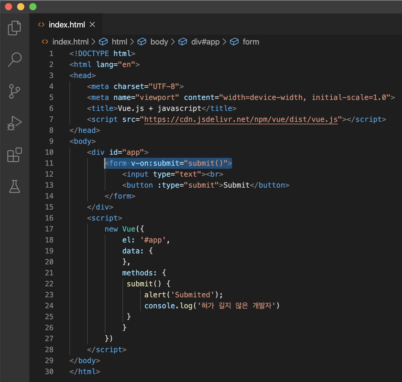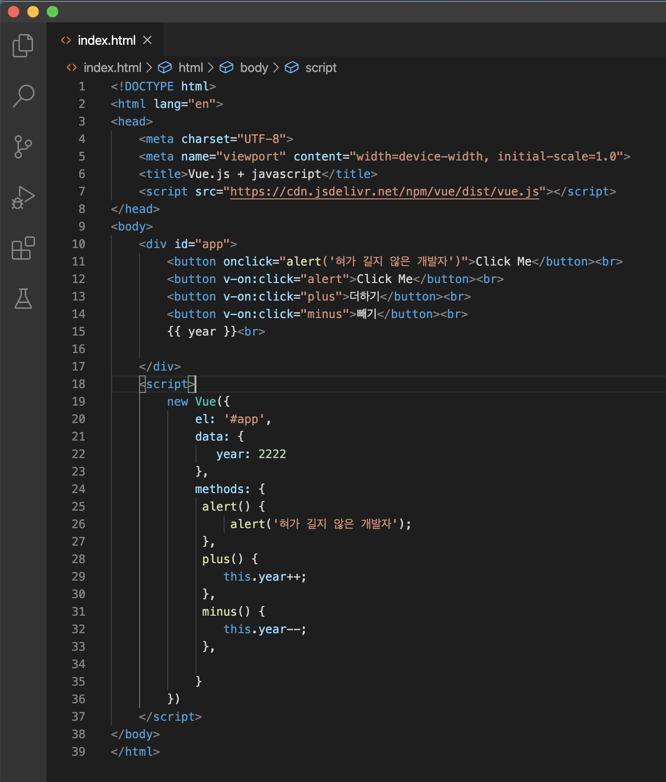 javascript에서 쓰이는 alert('혀가 길지 않은 개발자') 이벤트