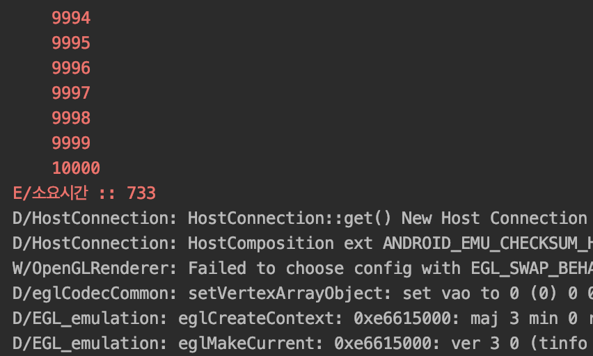 Log.e("소요시간 : ", elapsedTime.toString())